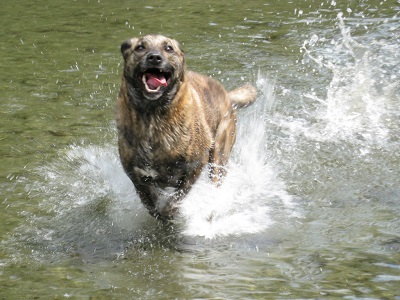 She isn't much for chasing balls or sticks either, it's more fun to steal them from other Dogs and be chased. And, for such a good swimmer, she simply "chooses not to", and just splashes around instead. Could have something to do with that first calm evening on the boat when she thought she could walk on water.