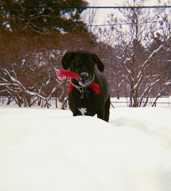 Hey Dad! This snow is great! Not quite as much fun as chasing otters on the beach but there are squirrels here. We weren't too keen on the trip out. You did a good job making up the Magic Dog Houses but Dogs were not meant to fly.